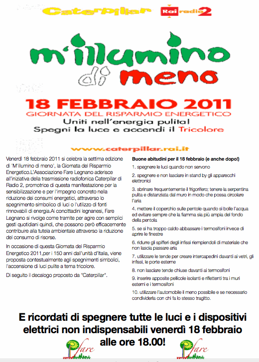 Friday, February 18, 2011 we celebrate the seventh edition of 'M'illumino less', the World Savings Day Energetico.L' Association Click Legnano endorses the radio broadcast of Radio Caterpillar 2, promoter of this event to raise awareness and concrete commitment to reduce energy consumption by switching off lights or symbolic use of renewable energia.Ai Legnanesi fellow citizens, to fetch wood turns to act as a conduit with simple everyday actions then, but they can effectively contribute to environmental protection by reducing resource consumption.